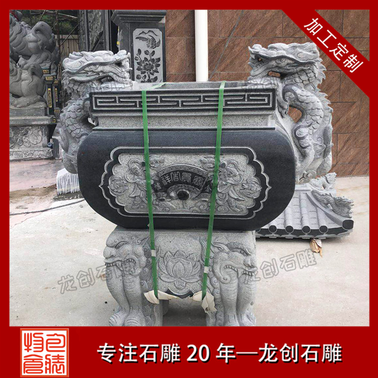 寺廟石雕香爐,佛教中稱它寶鼎,除了方形的香爐外,還有圓形。圓形香爐都有三足,一足在前,兩足在后,是如法的放置;常以之譬喻佛教中的三寶,缺一不可。中華民族香文化發展得很早,古時候的人就常以焚香木熏居室以除臭穢,所以古人讀書彈琴,喜歡先焚一爐香,可以凈雜念而使精神集中。重視欽水思源,慎終追遠是中國人的美德,所以自古以來,華人都拜天地神祗,祭祖先;上香表示敬意,是祭拜儀式中的一個主要項目,香爐就派上用場了。