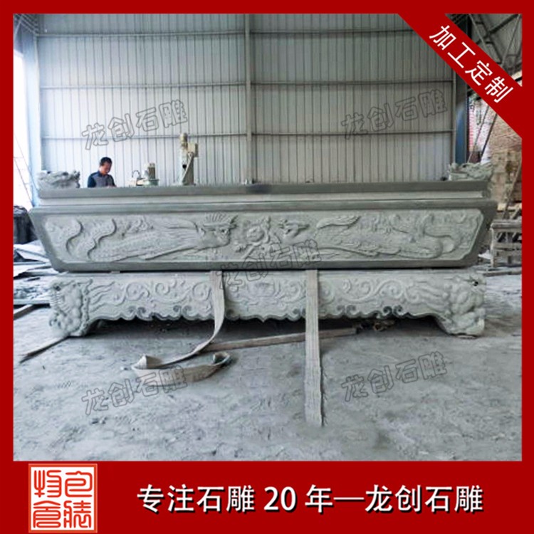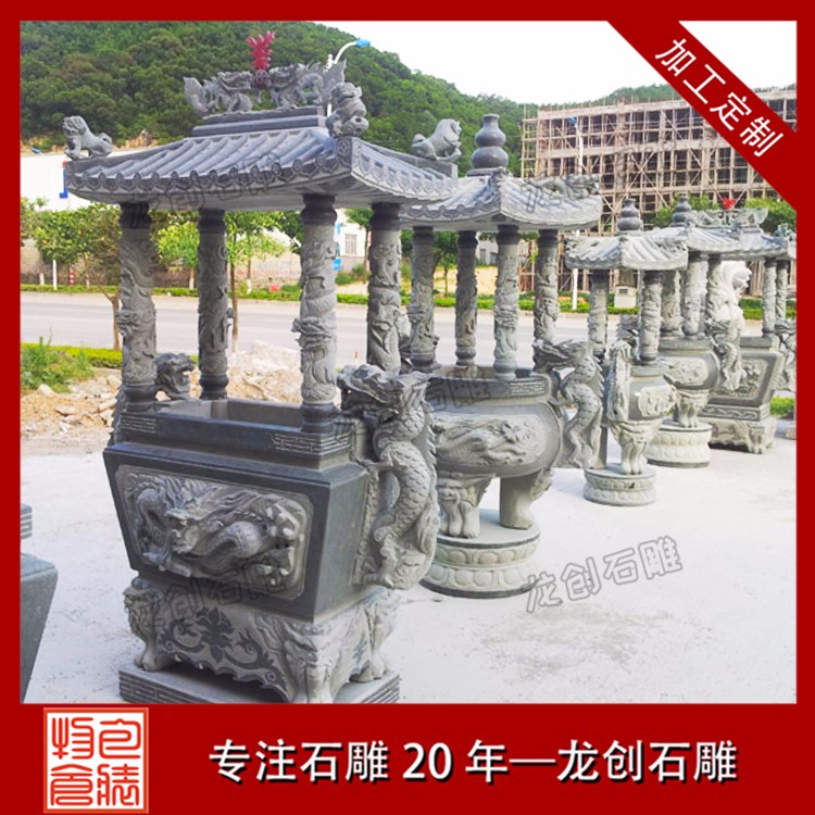 大型石雕香爐的制作石材通常是優質顏色偏深的花崗巖石料和青石石料,青石本身顏色呈現青色,較為古樸,青石石雕香爐突顯了整個香爐的莊重氛圍,為佛教圣地增添了幾分威嚴。石雕香爐的外形分為圓口、方形口、長方形口,圓口香爐一般是三足兩耳,方形香爐一般是四足兩耳,長方形香爐一般也是四足兩耳,還有少許兩層石雕香爐。
