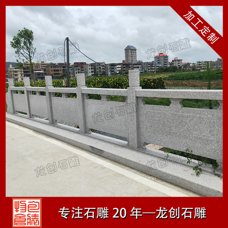 花崗巖欄桿選用優質天然花崗巖石材。常用的有芝麻白、芝麻灰、白麻、黃銹石、五蓮紅、五蓮花。花崗巖石欄桿是比較常用的欄桿材質。其硬度高、抗風化、后期基本無需打理。多用于河道、橋梁、景區等。石材顏色多樣,可選度高。常用做法為線雕、鏤空、浮雕。