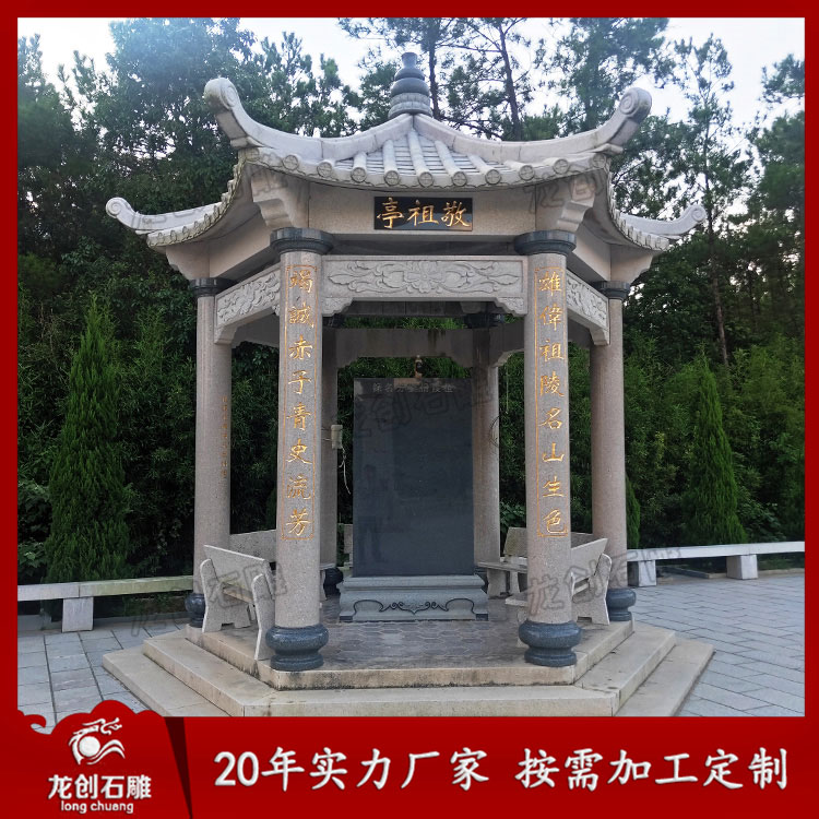 不管是四角石亭子還是六角石亭子,一般都為開敞性結構,頂部可分為四角,六角、八角、圓形等多種形狀。其材質多選用青石、花崗巖,晚霞紅等石材。泉州石亭子廠家,選惠安龍創石雕,專注石雕20年,支持按需定制。