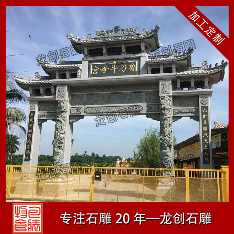 牌坊上經(jīng)常看到浮雕龍在中國的傳統(tǒng)文化中是吉祥的象征,龍在云中翱翔,將優(yōu)美的姿態(tài)展現(xiàn)給世人看,線條流暢;寓意龍龍四海,還有石獅子抱鼓石有鎮(zhèn)宅等作用,花鳥、圖案、龍鳳及各種瑞獸等都有祥瑞之意,修建這樣的石雕牌坊大門,更能令村莊吉祥如意。龍創(chuàng)石雕專注牌坊制作20年,堅守工匠本心,將每一座牌坊制作都追求優(yōu)質(zhì)。